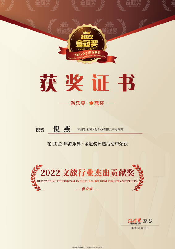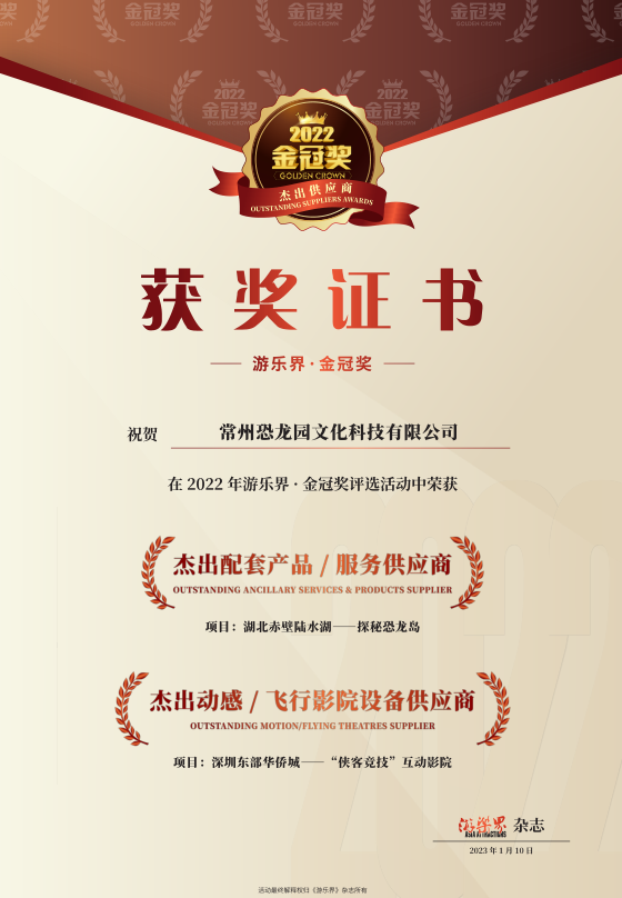 近日,文科公司凭借赤壁陆水湖《探秘恐龙岛》项目荣获游乐界·金冠奖“杰出配套产品/服务供应商”,凭借深圳东部华侨城《侠客竞技》互动影院项目荣获游乐界·金冠奖“杰出动感/飞行影院设备供应商”,文科公司负责人倪燕荣获游乐界·金冠奖“2022文旅行业杰出贡献奖”。